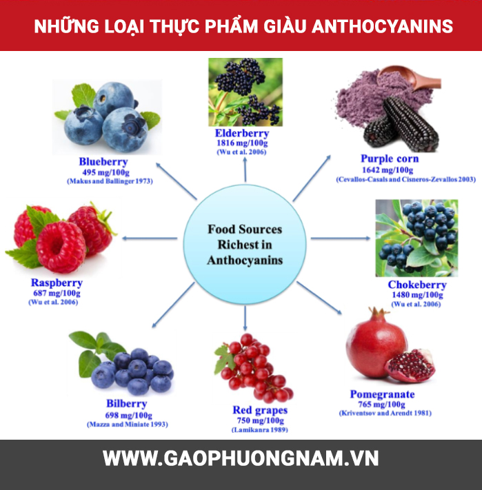 Các bạn có thể dễ dàng tìm thấy những loại thực phẩm giàu anthocyanins các lá, thân, rễ, hoa và quả có màu đỏ, đỏ tía, xanh dương, đen và tím như: