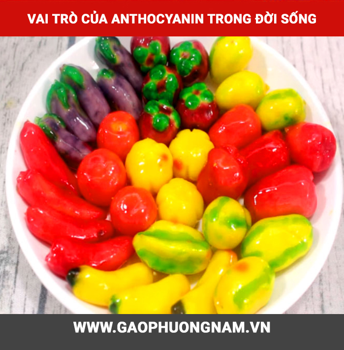 “Anthocyanins” với đặc tính dễ hoà tan trong nước và màu sắc tươi sáng như màu đỏ, màu tím, màu xanh,... nên có thể dễ dàng phối màu vào thực phẩm như tạo màu cho kẹo, bánh, nước giải khát,... không gây biến chứng, không gây độc và không gây đột biến gen cho con người khi sử dụng.