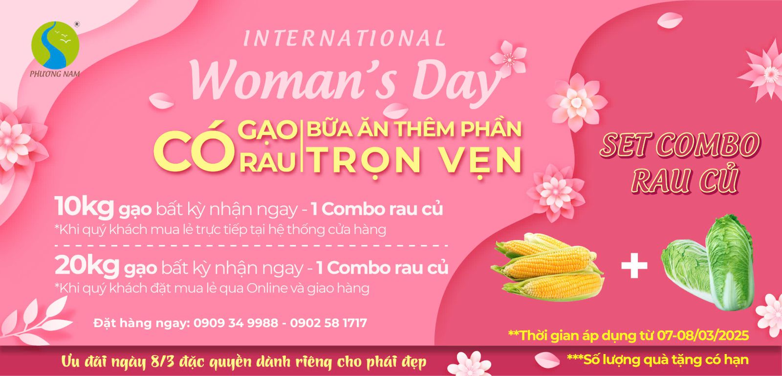 Ngày Quốc tế Phụ nữ, một nửa thế giới xứng đáng nhận được những điều tuyệt vời nhất! Nhân dịp 8/3, PHƯƠNG NAM dành tặng ưu đãi đặc biệt cho "phái đẹp" khi mua Gạo Ông Cua - Gạo ST25 chính hãng (của kỹ sư Hồ Quang Cua) tại các cửa hàng uỷ quyền, chương trình cụ thể như sau: