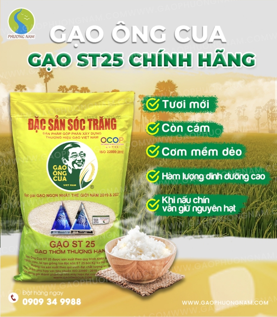 Gạo ST25 là loại gạo thơm thượng hạng đạt nhiều thương hiệu uy tín từ trong và nhà nước. Gạo ST25 (ông Cua) lúa ruộng (2 vụ/năm) là gạo ST25 được canh tác trên những cánh đồng, khu vực thổ nhưỡng chuyên trồng lúa ST25 trong 1 năm, dưới sự hướng dẫn kỹ thuật của kỹ sư Hồ Quang Cua.