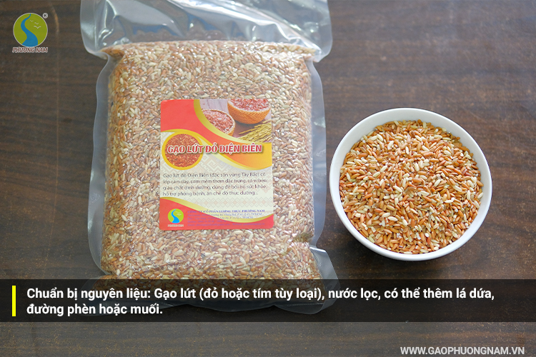 - Chuẩn bị nguyên liệu: Gạo lứt (đỏ hoặc tím tùy loại), nước lọc, có thể thêm lá dứa, đường phèn hoặc muối.