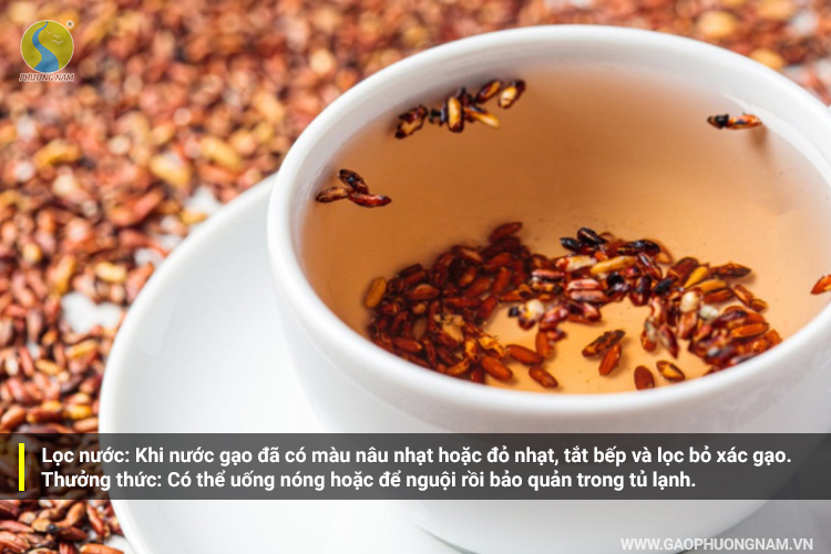 - Lọc nước: Khi nước gạo đã có màu nâu nhạt hoặc đỏ nhạt, tắt bếp và lọc bỏ xác gạo.