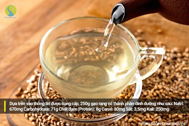 Nước gạo lứt rang không chỉ là một loại đồ uống giải khát mà còn chứa nhiều dưỡng chất thiết yếu. Dựa trên vào thông tin được cung cấp, 250g gạo rang có thành phần dinh dưỡng như sau: