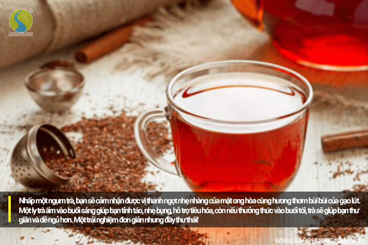 Nhấp một ngụm trà, bạn sẽ cảm nhận được vị thanh ngọt nhẹ nhàng của mật ong hòa cùng hương thơm bùi bùi của gạo lứt. Một ly trà ấm vào buổi sáng giúp bạn tỉnh táo, nhẹ bụng, hỗ trợ tiêu hóa, còn nếu thưởng thức vào buổi tối, trà sẽ giúp bạn thư giãn và dễ ngủ hơn. Một trải nghiệm đơn giản nhưng đầy thư thái!